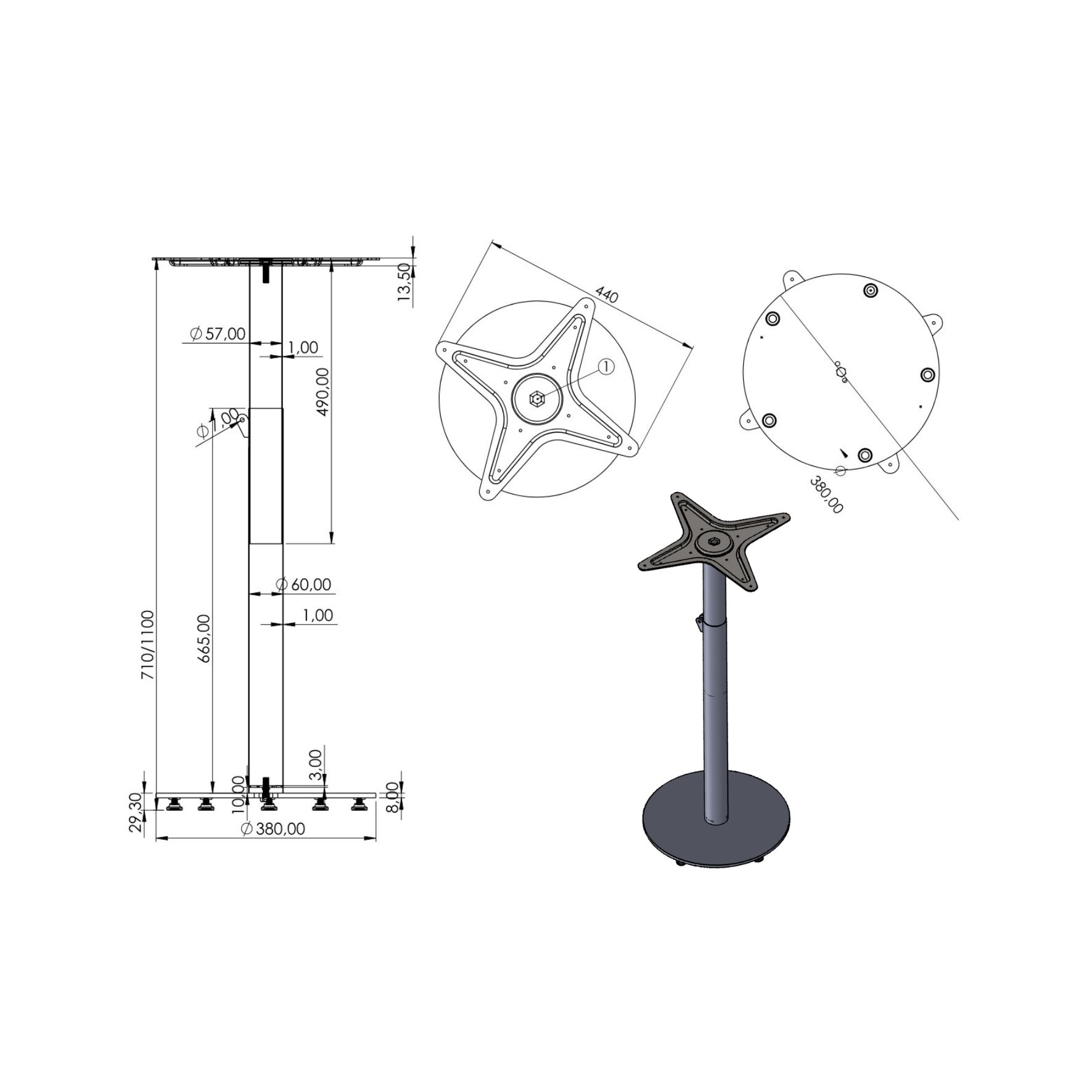 Η στρογγυλή βάση Ø38 cm διαθέτει 5 ρεγουλατόρους, εξασφαλίζοντας μέγιστη ισορροπία ακόμη και σε ανώμαλες επιφάνειες. Ιδανικό για μπαρ, καφετέριες, εστιατόρια αλλά και για οικιακή χρήση, το συγκεκριμένο πόδι προσαρμόζεται εύκολα στις ανάγκες κάθε χώρου.